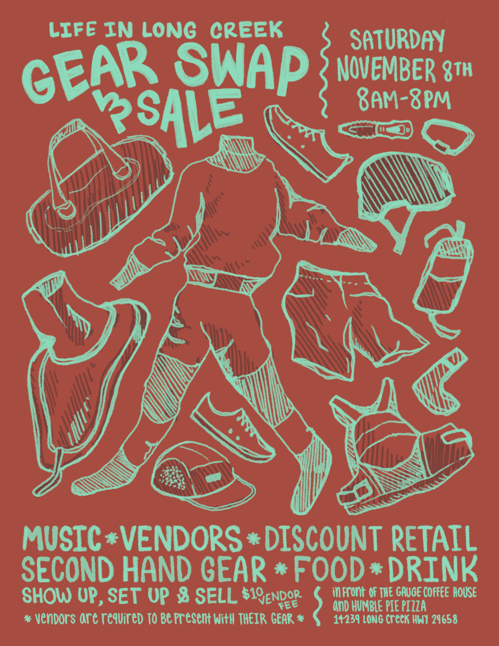 Gear Swap & Sale on Saturday, Nov. 8 (8 a.m.–8 p.m.) in front of The Gauge Coffee House and Humble Pie Pizza.